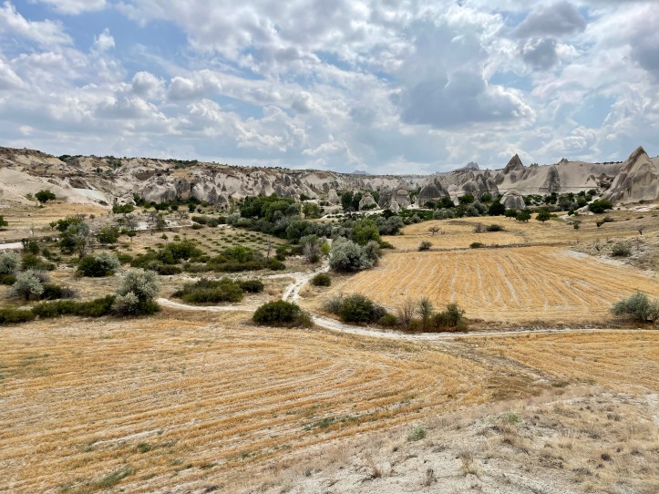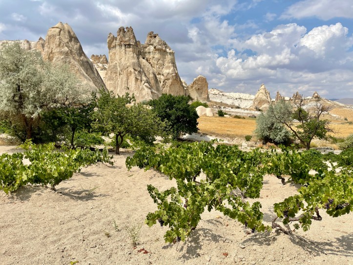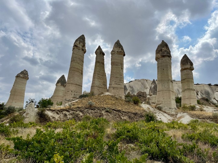 We hiked in along a dry creek bed and found grapes and other produce growing, After exploring the area, we went over to the dirt road and followed it back to the fairy chimneys. The fairy chimneys are upright columns, rounded on top. They weather and erode over the years and the harder rock remains. This whole area used to be volcanic. I was even able to FaceTime my mom from the valley and show her and my stepdad the cool rocks!