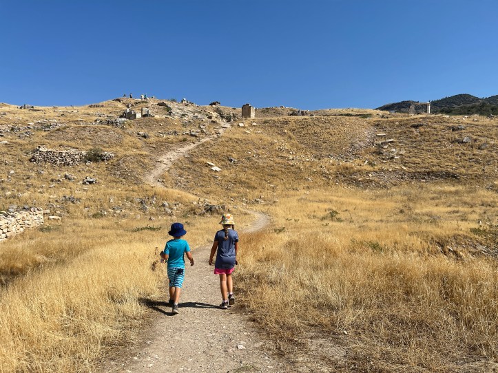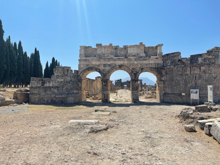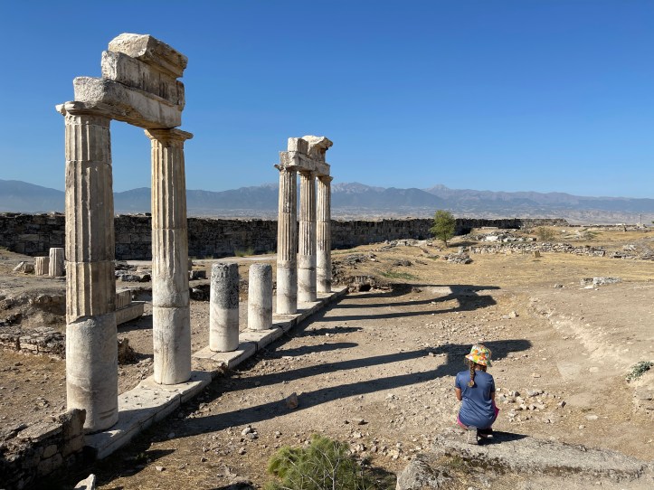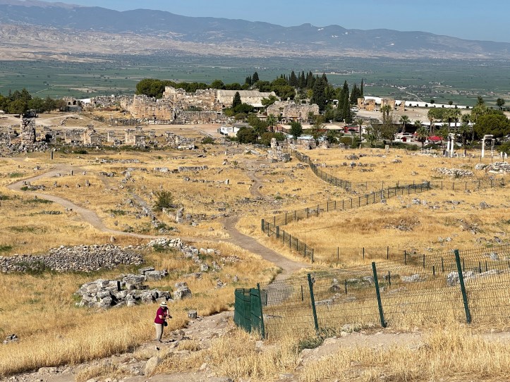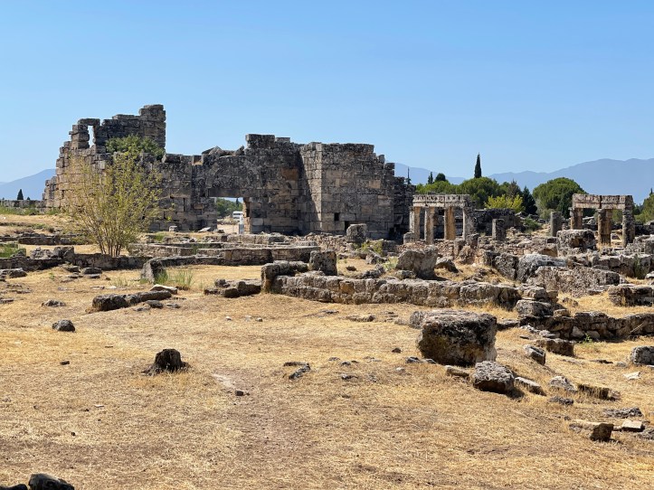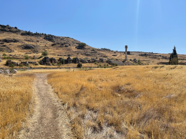 It was really hot and not much shade. Mid August is not the time to do Pamukkale! There were a lot of tour groups, so we had to avoid them too. We started at the gymnasium, headed up to the amphitheater, then farther uphill went to the tomb and church (Martyrion) of the Apostle Phillip. We headed back downhill to the Agora and Baths.