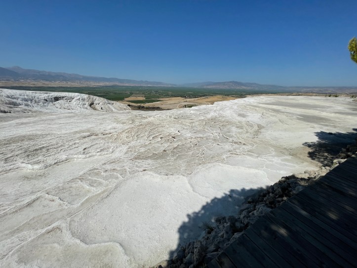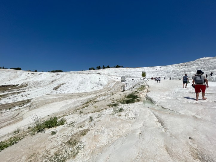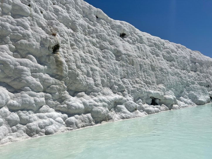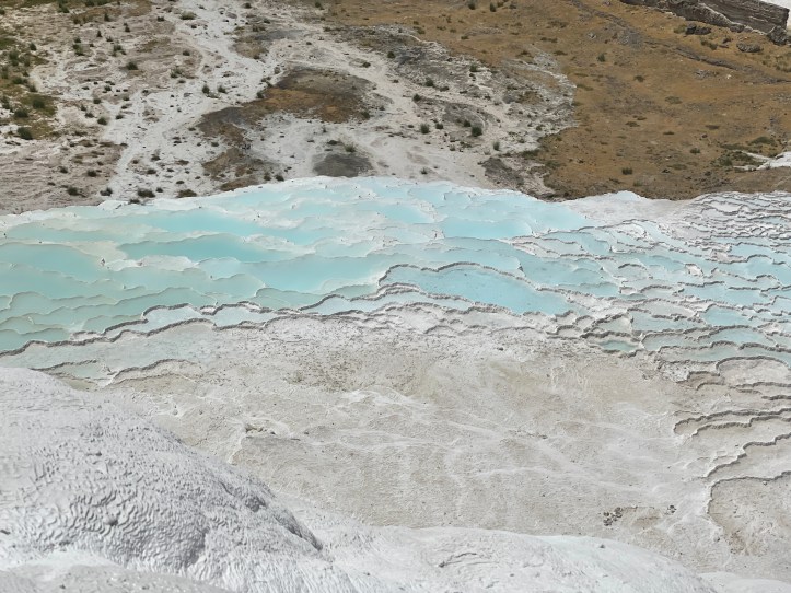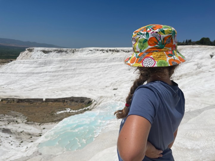 Our last morning of vacation, we did the travertines of Pamukkale and the ruins of Hieropolis. The travertines are these white slopes of rock with pools as you go down the mountain. There used to be a ton of these pools, but there are not as many now and people are restricted to one path. It is a combo ticket to do the ruins and the pools, which is awkward as we wanted hiking stuff for the ruins and much less coverage for the pools!