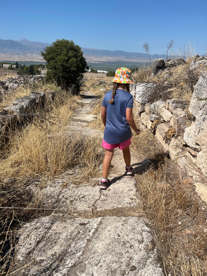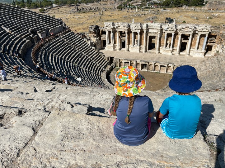 It was a lot of walking and hot and I started to get a migraine (which is not uncommon for me). Kids and I headed off to find a cafe and ice cream while DH and his folks finished the ruins. Near Cleopatra’s Bath is a collection of buildings. You can enter the bath area for free, but to swim costs additional money. We found a small coffee and ice cream stand and got some (expensive!) ice cream and found a shady picnic table for a rest. It was super chaotic in the pool area with long lines for bathrooms and people everywhere.