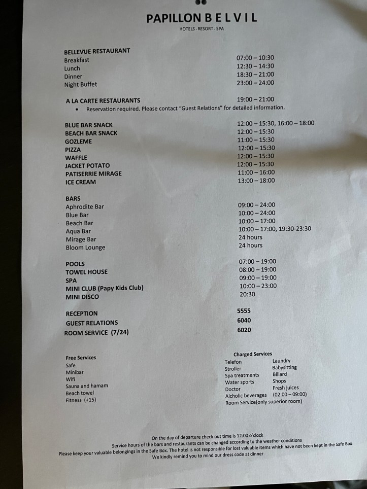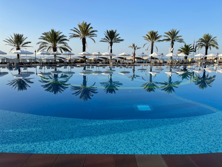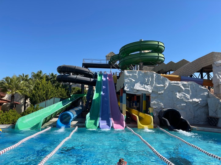 Belek is 6.5 hours from our home in Ankara. We left promptly in the morning, stopped about 4 hours in for lunch, and got to the hotel about 3. This gave us plenty of time to check in and do the water slides! The water slides closed at 6 and the pools at 7. Each day we’d finish up between 6 and 6:30, head back to the room to shower and change, and head to dinner. It’s lovely that the kids are old enough to spend all day by the pool and beach! We’d get there between 9 and 9:30 and stay all day long!
