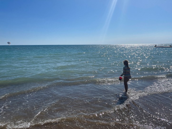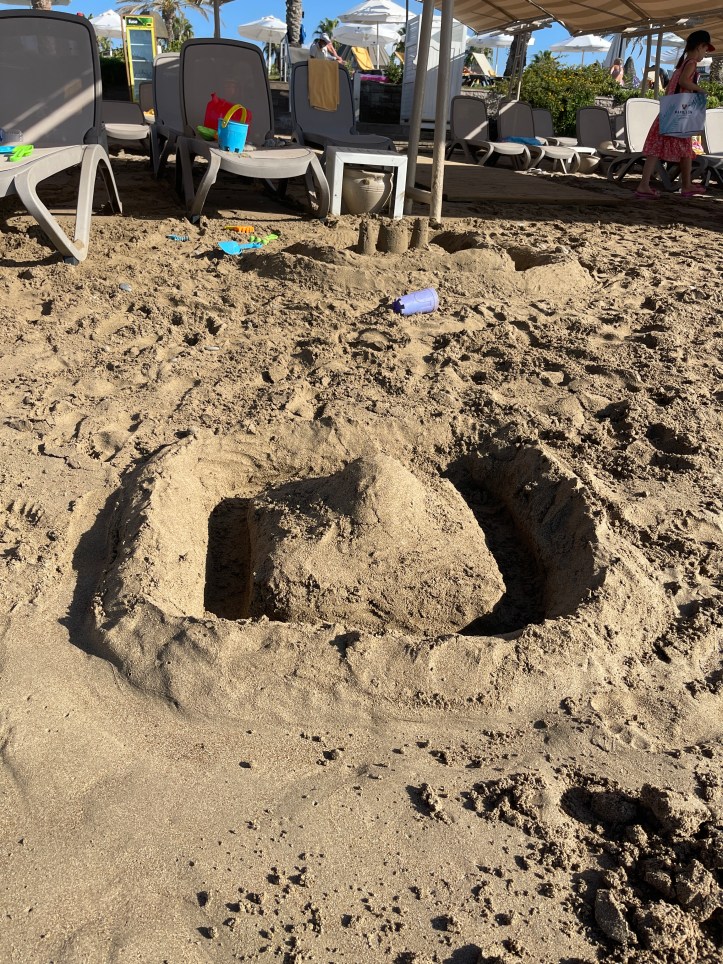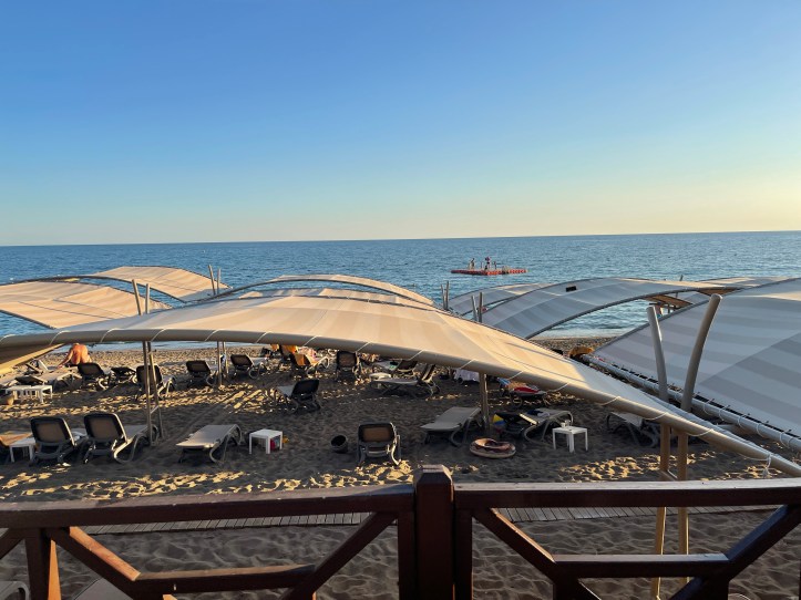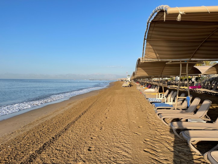 The beach was pretty sandy and good for sand castles. The Med Sea is mostly rocky/pebbly, so the resorts bring in sand. You could definitely find a lot of rocks and not so many shells (though we found some). The loungers all had shade and there were plenty of loungers. Though if you wanted one in the front row, you had to get there early as well. The water was fairly calm in the morning, but was rougher in the afternoon. There was a platform you could swim out to.