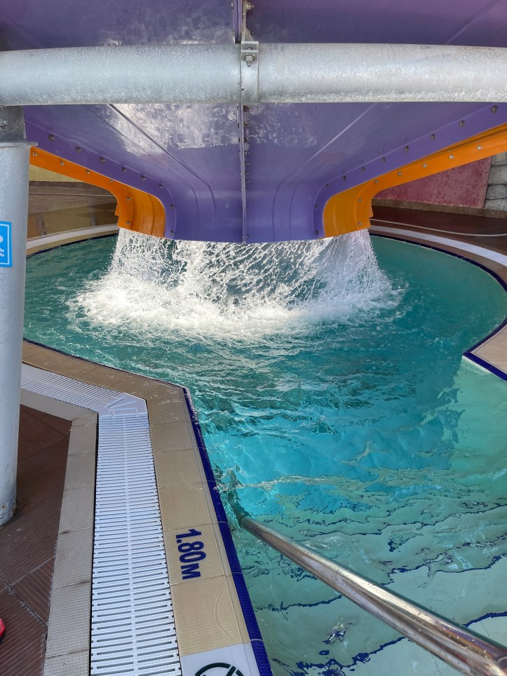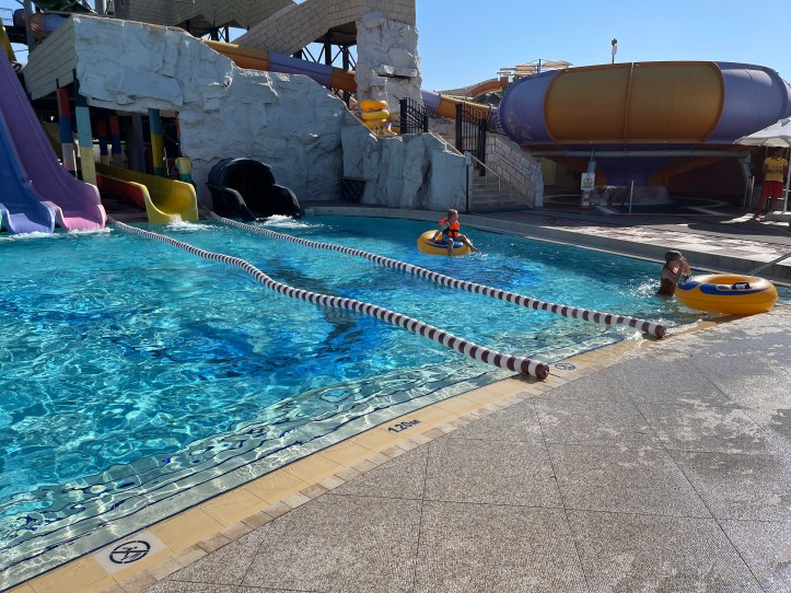 Near the waterslides was a fun pool with a world map on the floor. Kids alternated between the waterslides and this pool. There was also a much larger pool in the center with a baby pool next to it. Kids said that pool was too cold, so we didn’t do it much! There is also an 18+ pool on the far side away from the waterslides.