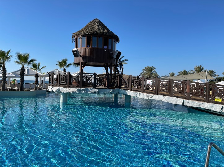 Lunch you could do the buffet inside, which we never did, or there were outside options. They had a number of food stalls open midday–pizza, gozleme, baked potato bar, ice cream, and waffles. They also had a mini buffet poolside with things like chicken nuggets, meat skewers, pasta, soup, salad, French fries, veggies, etc. From 4-6 pm, they added donuts and some other snack things! We loved Donut Hour! The bars had alcoholic and nonalcoholic drinks and the kids loved getting special beverages.