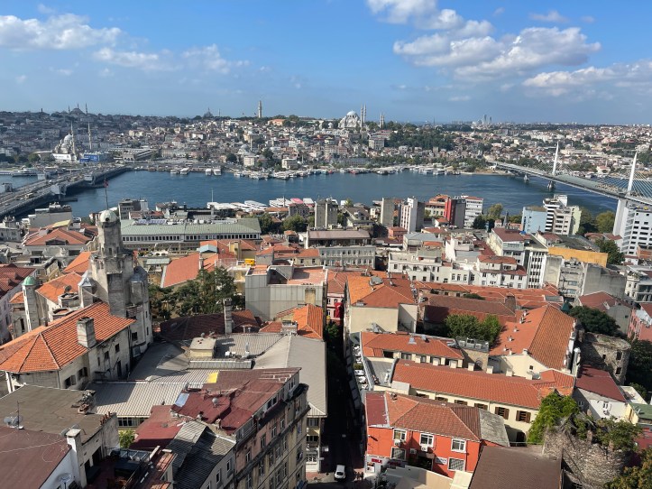 You can cross the bridge at the upper car level on a wide sidewalk, or go down and walk along the lower level that has restaurants. We did the upper level. Once across, we strolled through a street filled with auto repair parts and then started the uphill hike to Galata Tower (5th Century). The tower of course is on a high point and we had to get all the way up from sea level. It was about a 40 min walk from our AirBnb and about 22 from the Egyptian Bazaar. We got our tickets and were there not long after opening when there were few people. Our MuseKarts got the kids and me entry.
