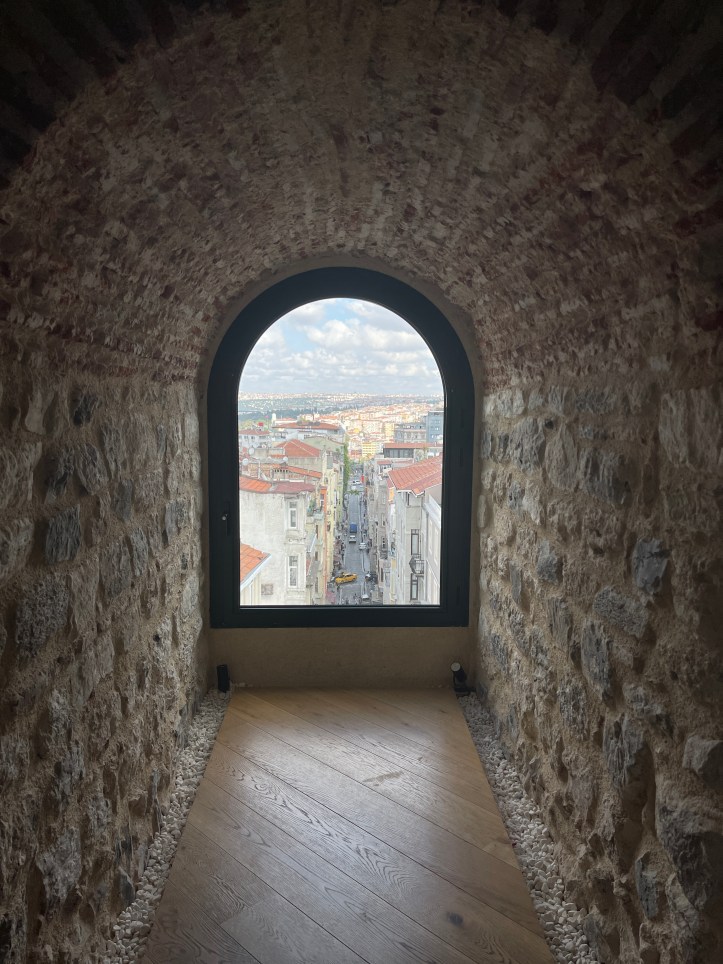 You ride the elevator up to the top and then walk your way down the tower. Getting to the highest level requires one flight of stairs up. The tower was way cooler than I thought it would be. Along with 360 views from the top level, as you work your way down, each floor has exhibits. We saw artifacts, photography, a 3D model of the city, etc. There was even an animation thing where you pretended to fly across the Golden Horn. Definitely get there before the crowds for the best experience and shortest wait (we had 0 wait).