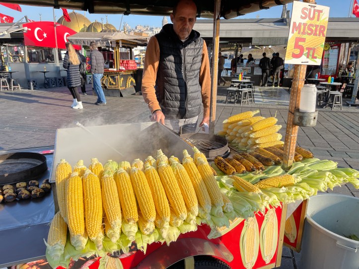 We then wandered the Egyptian Spice Market. The kids LOVE getting samples. We stopped at one stall to find out what the purple Turkish delight was (pomegranate it turned out) and they proceeded to give us MASSIVE samples of every flavor. So then, of course, we ended up buying a ton too. We headed outside to buy grilled corn and simit (a type of bread with sesame seeds) before heading back to our rental for the drive back to Ankara. Overall, a wonderful weekend trip to Istanbul.